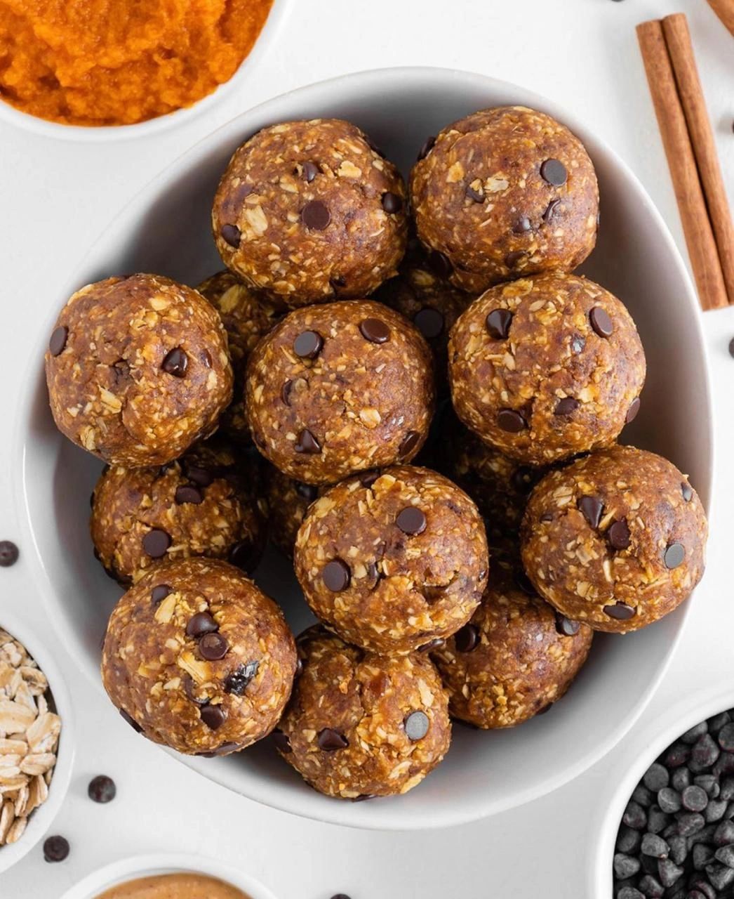 ¡Estas bolas energéticas de calabaza son lo máximo! MEJOR bocadillo de otoño! Son súper suaves y masticables, perfectamente dulces y cargados de sabores otoñales. Calabaza, dátiles, avena, mantequilla de maní y especias de otoño, que incluyen canela, jengibre y nuez moscada, se empaquetan en una bola del tamaño de un bocado. Es una receta sin hornear, vegana y sin gluten que está lista en solo 10 minutos. ¡Disfrútelos como bocadillo al mediodía o un postre delicioso!.