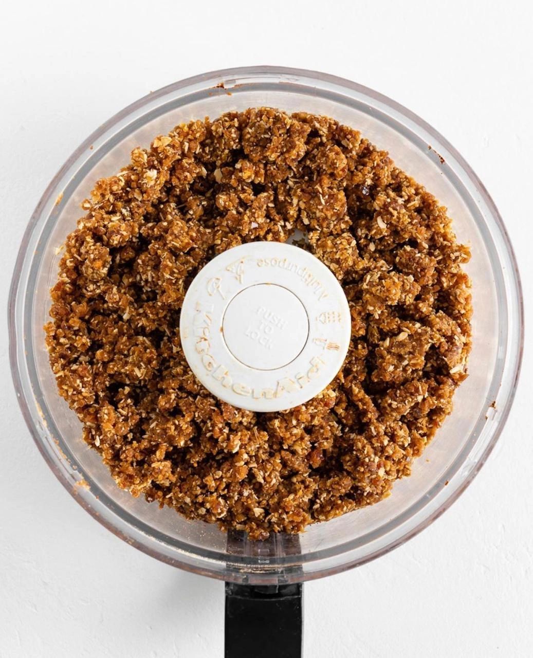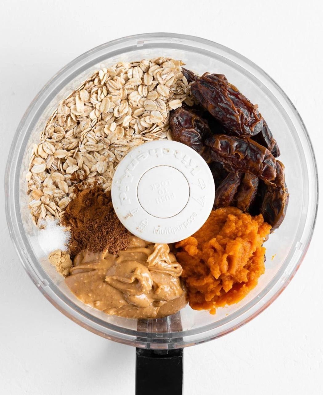 Agregue avena, dátiles, mantequilla de maní, calabaza, vainilla, canela, jengibre, nuez moscada y sal a la base de un procesador de alimentos. Procese los ingredientes hasta que se forme una masa pegajosa y casi suave. La masa debe poder pellizcarse y pegarse cuando la presiones con las manos. Transfiera la masa a un tazón grande. Agregue mini chispas de chocolate y mezcle para combinar. Enrolle la masa en bolas de 1 pulgada. ¡Disfrutar!